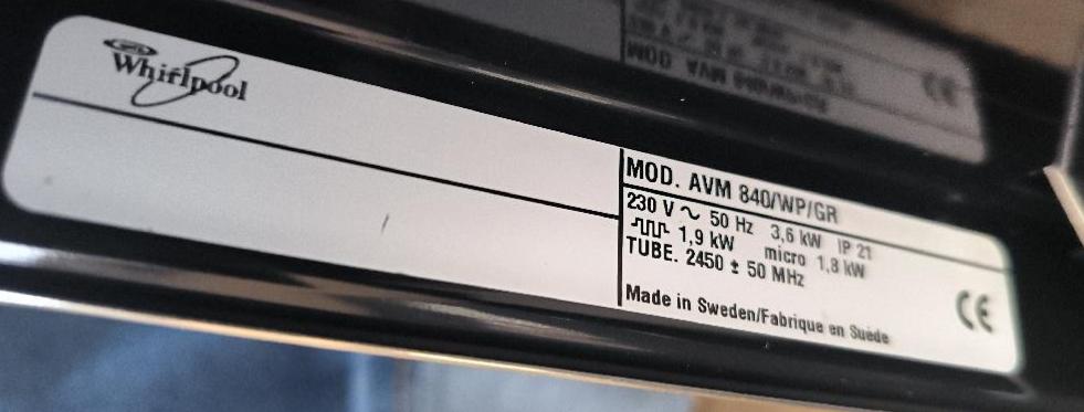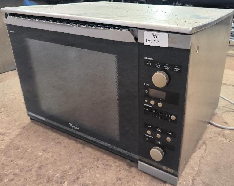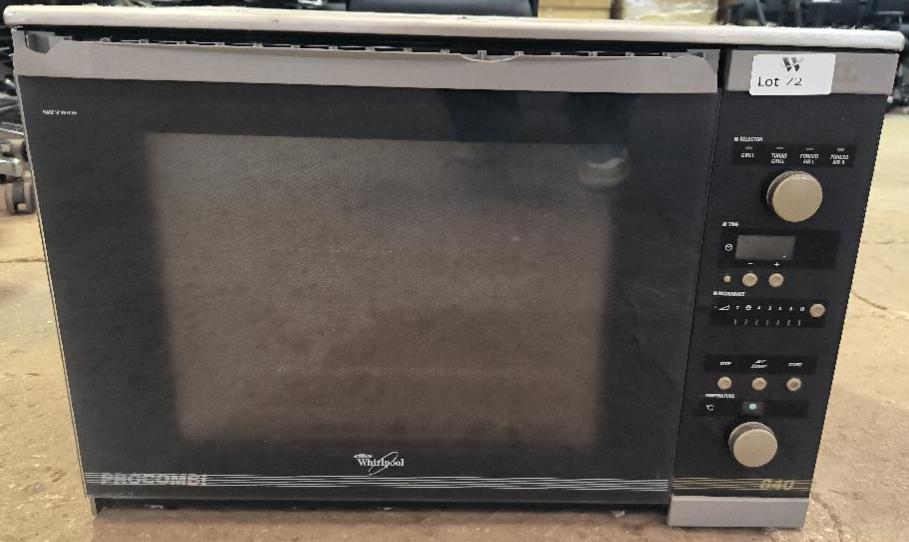 Four micro-ondes combiné de marque Whirlpool modèle AVM 840/WP/GR, poignet cassée. Dim : 39 x 55 x 55 cm. Localisation : 34 avenue du Général Patton 02880 Crouy