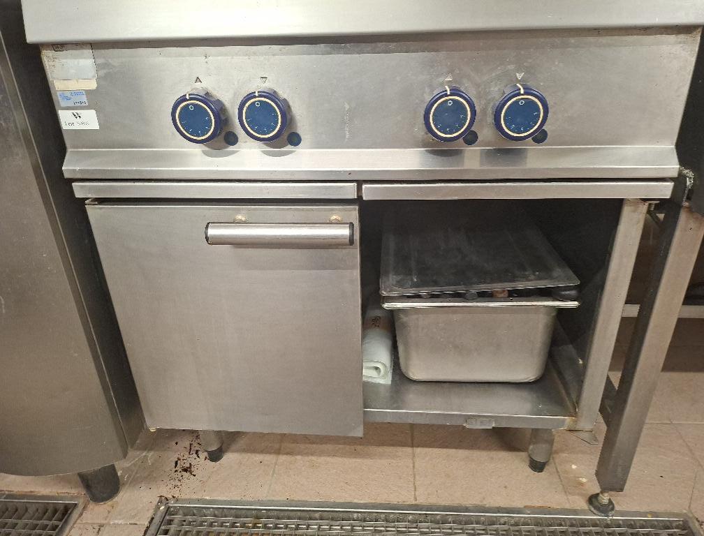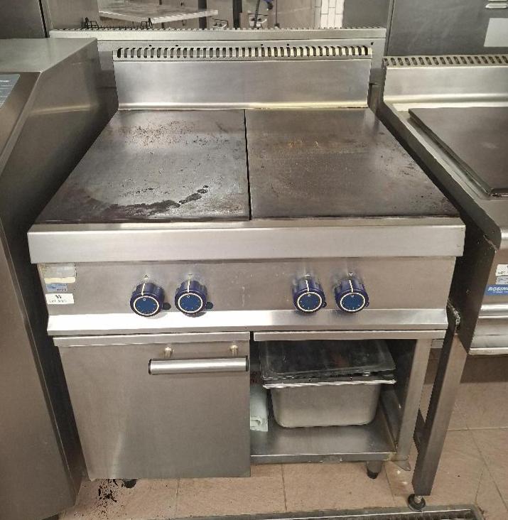 Grillade de marque Hobart à 2 plaques en fonte 4 feux et 1 placard (manque 1 porte). 107 x 80 x 95 cm. Localisation: cuisines