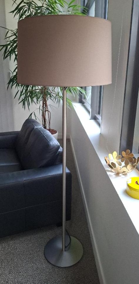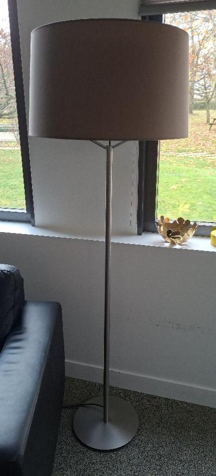 Lampe de parquet de marque Carpyen modèle Jerry Pie en métal brosser et abat-jour en tissu couleur taupe. Hauteur 168 cm. (rdc). Localisation: 10 rue d’Arcueil – 94150 Rungis