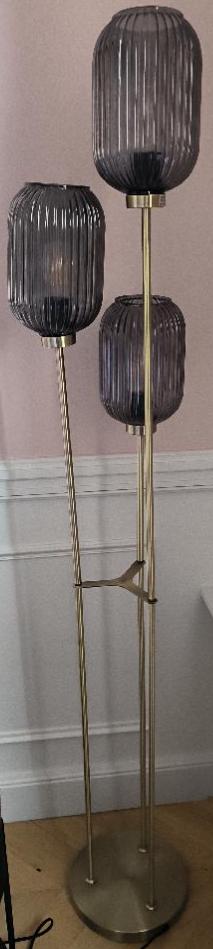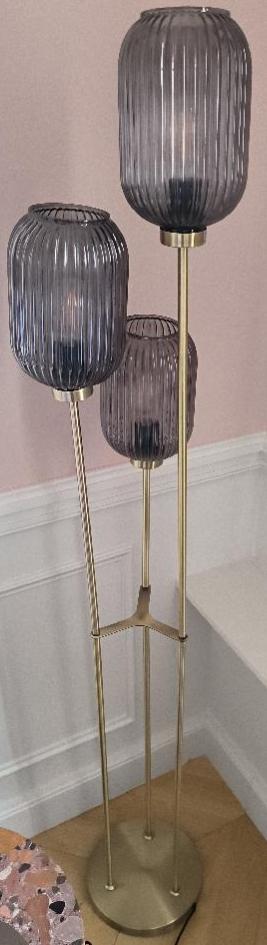 Lampe de parquet structure 3 tiges en métal doré, 3 abat-jours en verre fumé. Dim : 157 x 35 cm. 2 unités. Vendu à l’unité avec faculté de réunion. Localisation: BLB, 3 rue de la Fossé aux Leux – 91700 Sainte Geneviève des Bois