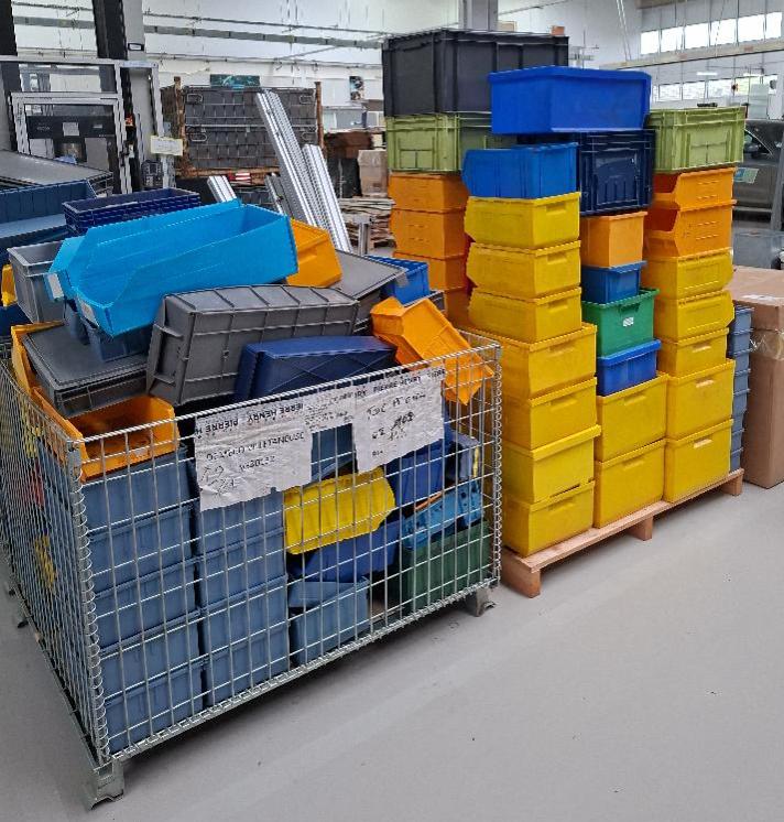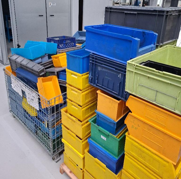 Lot d’une centaine de bacs plastiques d’atelier, diverses tailles et couleurs.