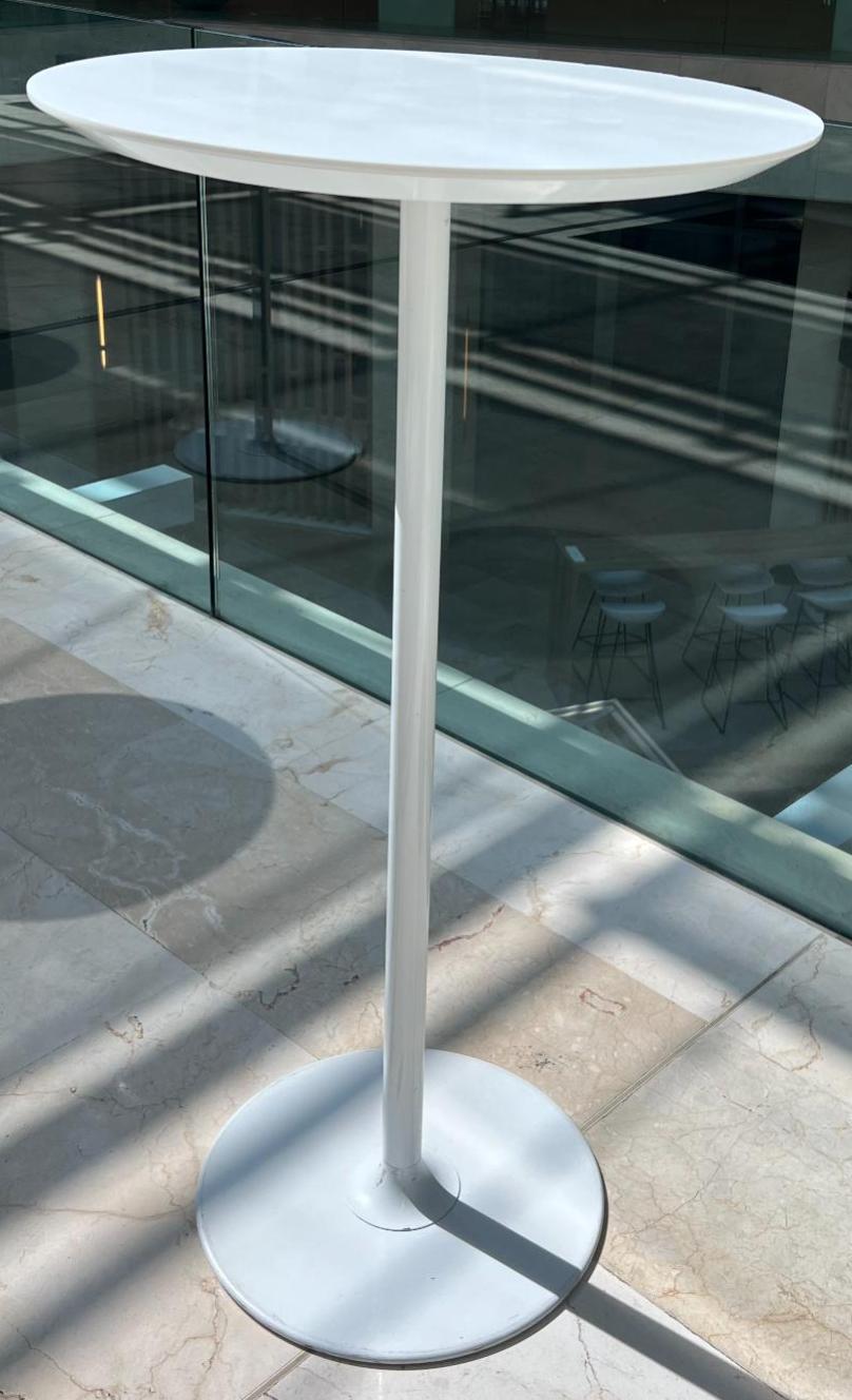 Mange debout, plateau rond en bois blanc, piétement colonne en acier laqué blanc. 110 x 60 cm. 2 unités. Vendu à l’unité avec faculté de réunion. Localisation: 30 rue Beauregard 60440 Nanteuil-le-Haudouin.