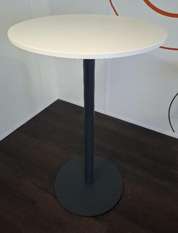 Mange debout, plateau rond en bois stratifié blanc reposant sur un pied colonne en acier laqué noir sur base circulaire. 111 x 70 cm. 8 unités. Localisation: 5ème étage (1 unité) / 4ème étage (3 unités) / 3ème étage (2 unités) / 2ème étage (1 unité) / 1er cafet (1 unité)