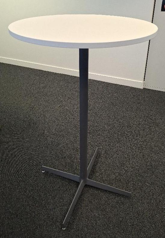 Mange debout, plateau rond en bois stratifié blanc reposant sur un piétement colonne en acier laqué anthracite sur base en étoile à 4 branches. 112 x 69 cm. 5 unités. Localisation: 6ème étage open space (3 unités) / -1 réserve (2 unités)