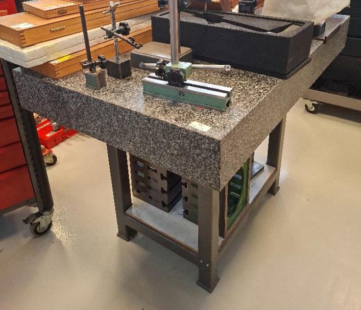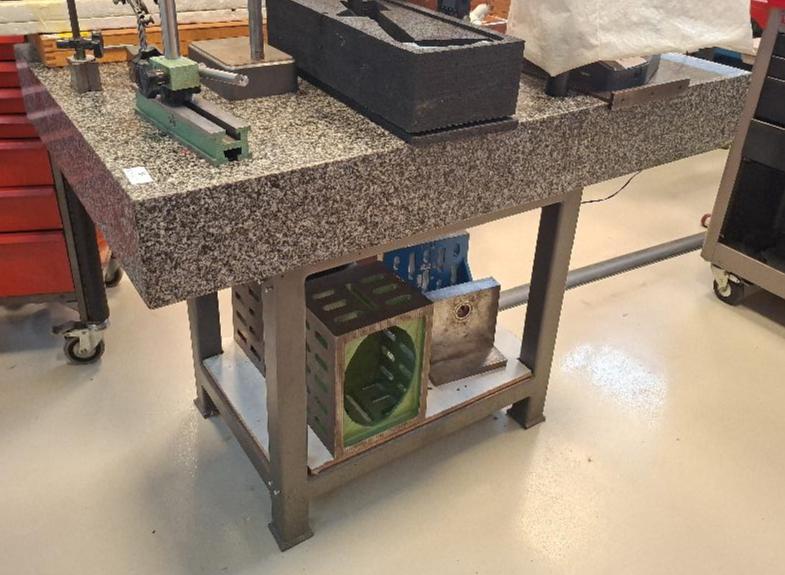 Marbre d’atelier sur piètement en acier gris. 91 x 121 x 81 cm
