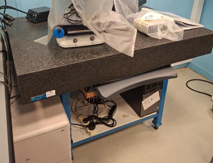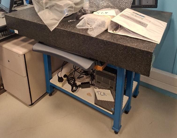 Marbre d’atelier sur piètement en acier laqué bleu. 91 x 121 x 81 cm