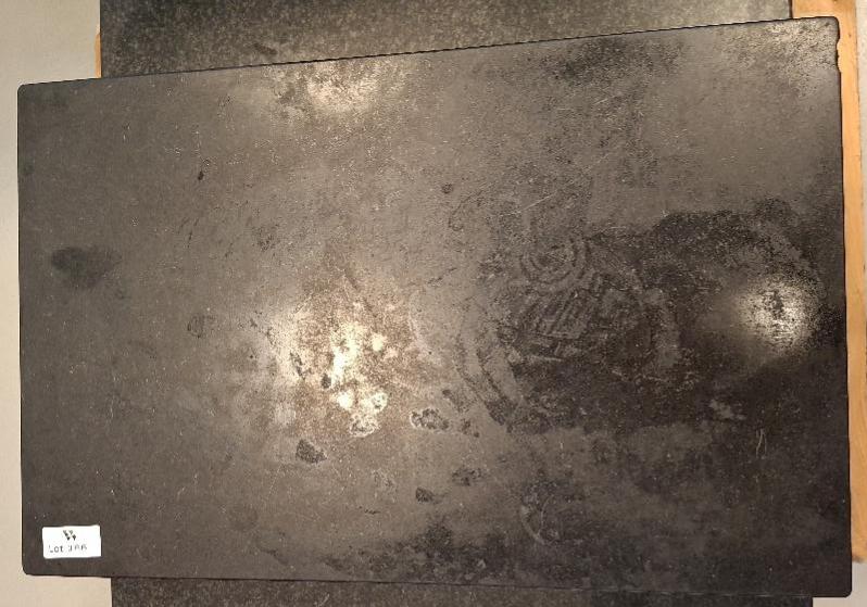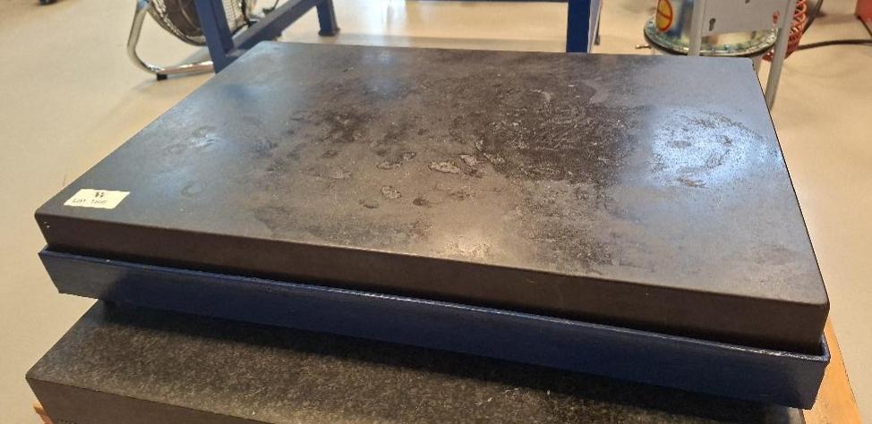 Marbre d’atelier sur socle en acier laqué bleu. 12 x 65 x 42 cm