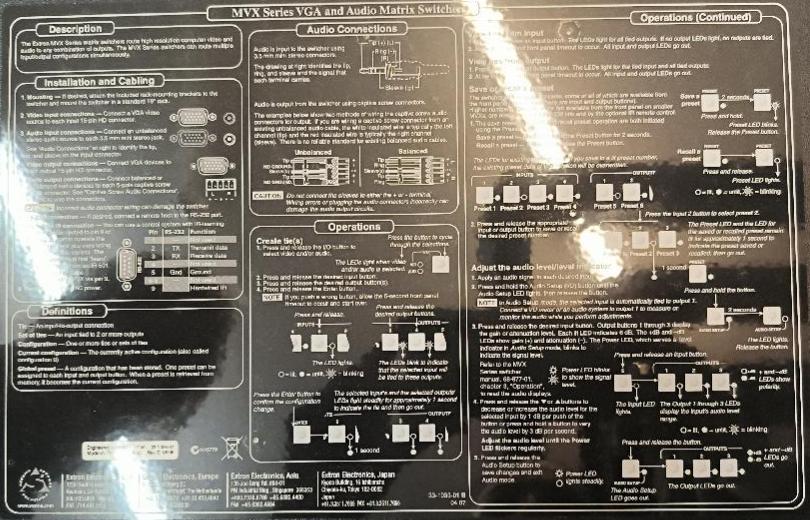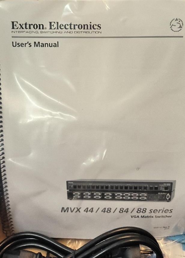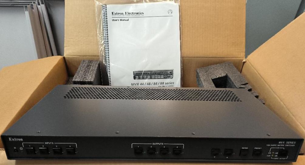 Matrice de commutation VGA/audio de marque Extron Electronics modèle MVX 44 VGA A. Non testé. 3 unités. Vendu à l’unité avec faculté de réunion. Localisation : 30 rue Beauregard 60440 Nanteuil-le-Haudouin