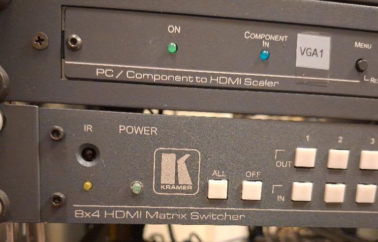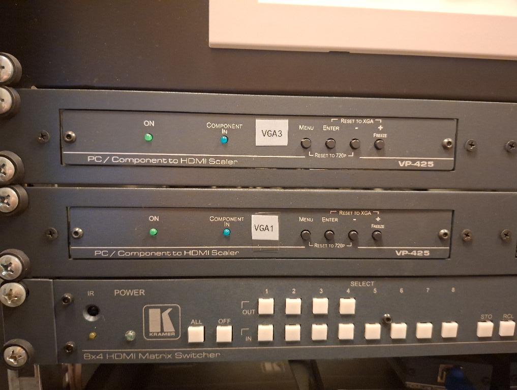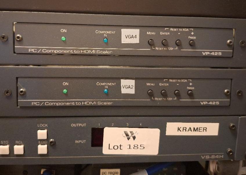 Matrix switcher de marque Kramer modèle VS84H et 4 modules VP425. Localisation: auditorium
