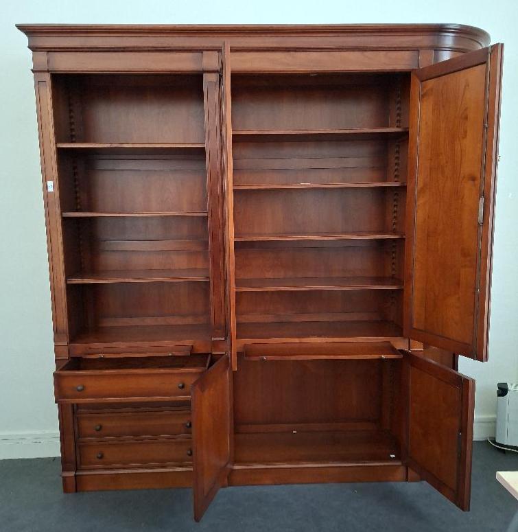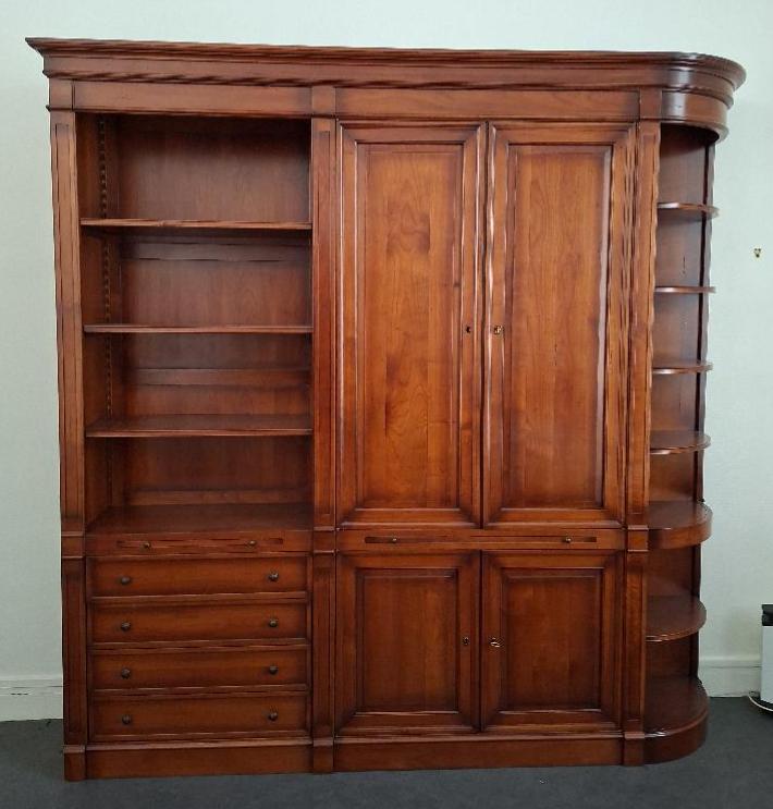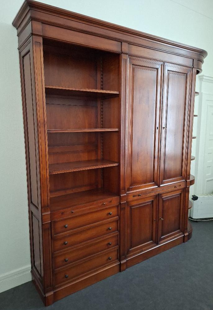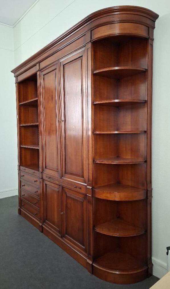 Meuble bibliothèque en bois couleur merisier en 3 parties, dont une à 3 étagères et 4 tiroirs, une ouvrant par 4 portes sur 4 étagères et un placard, et une partie en encoignure à 7 étagères. 243 x 235 x 41 cm. Localisation: BLB, 3 rue de la Fossé aux Leux – 91700 Sainte Geneviève des Bois