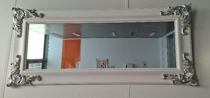 Miroir rectangulaire en bois laqué blanc avec écoinçons à décor de feuilles d’acanthe argentés. 80 x 178 cm. Localisation: 19 rue Neuve Tolbiac – 75013 Paris (7ème étage)