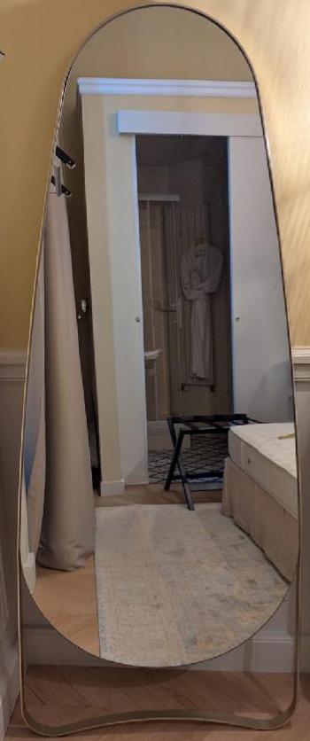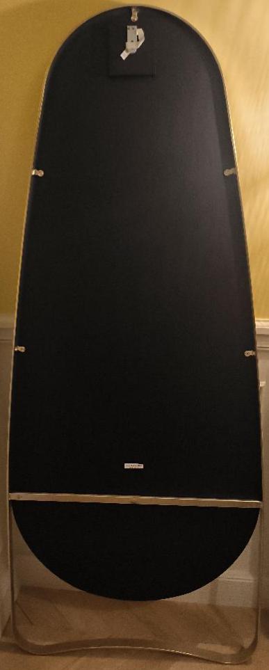 Miroir sur pied de forme ovale en acier doré. Dim : 167 x 66 cm. 10 unités. Vendu à l’unité avec faculté de réunion. Localisation: BLB, 3 rue de la Fossé aux Leux – 91700 Sainte Geneviève des Bois