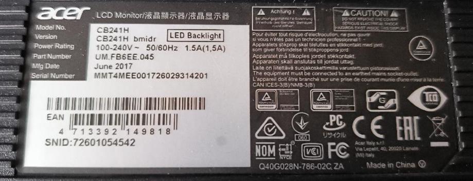 Moniteur 24 pouces de la marque Acer modèle CB241H. 43 unités. Vendu à l’unité avec faculté de réunion. Localisation: 30 rue Beauregard 60440 Nanteuil-le-Haudouin.