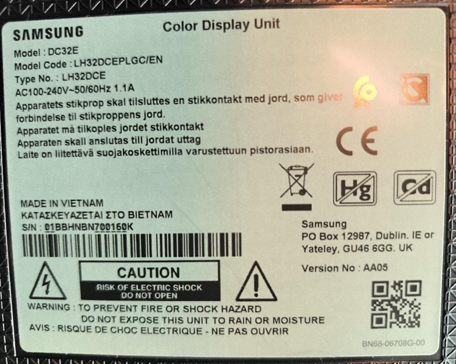 Moniteur 32 pouces de marque Samsung modèle DC32E / LH32DCEPLGC. Non testé. Localisation : 30 rue Beauregard 60440 Nanteuil-le-Haudouin