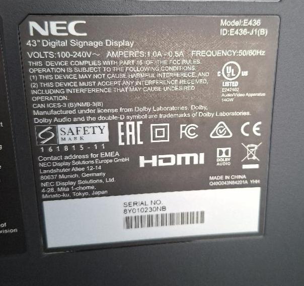 Moniteur 43 pouces de marque Nec modèle E436, sur pied. 2 unités. Localisation: 5ème étage zone verte