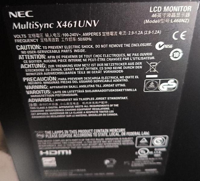 Moniteur 46 pouces de marque NEC modèle MultiSync X461 UNV. Non testé. Localisation : 30 rue Beauregard 60440 Nanteuil-le-Haudouin
