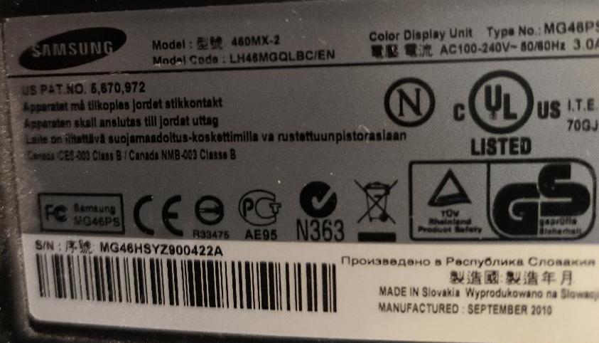 Moniteur 46 pouces de marque Samsung modèle 460MX-2 / LH46MGQLBC. Non testé. Localisation : 30 rue Beauregard 60440 Nanteuil-le-Haudouin