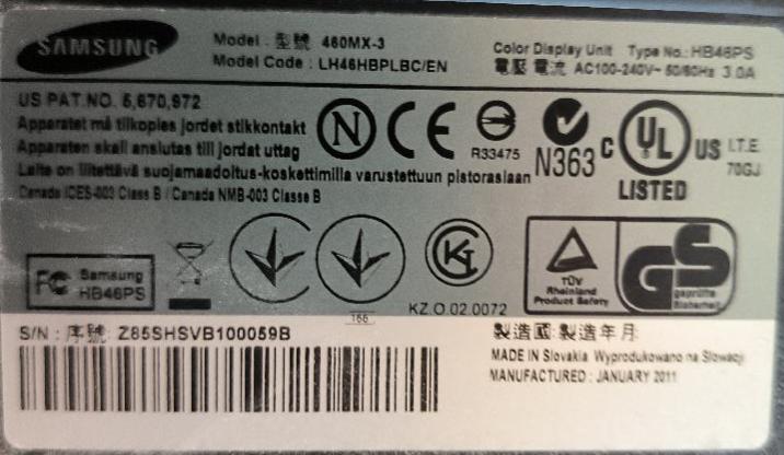 Moniteur 46 pouces de marque Samsung modèle 460MX-3 / LH46HBPLBC. Non testé. 3 unités. Vendu à l’unité avec faculté de réunion. Localisation : 30 rue Beauregard 60440 Nanteuil-le-Haudouin