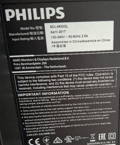Moniteur 48 pouces de marque Philips modèle BDL4830QL. 4 unités. Vendu à l’unité avec faculté de réunion. Localisation: 26 rue Cambaceres – 75008 Paris. (6eme, 2eme, 1er, hall)