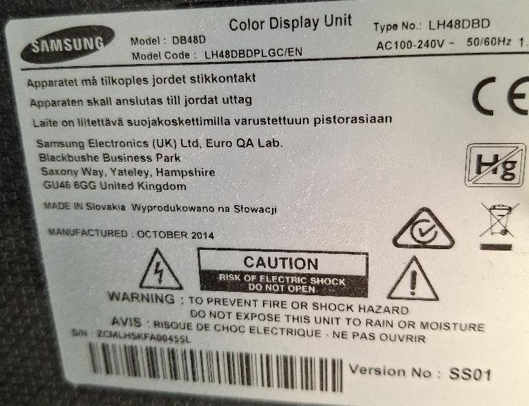 Moniteur 48 pouces de marque Samsung modèle DB48D. 1 unité. Localisation: 30 rue Beauregard - 60440 Nanteuil-le-Haudouin