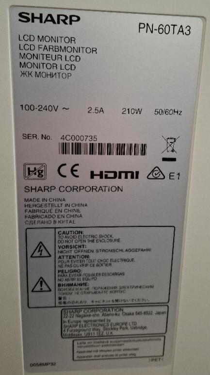 Moniteur 60 pouces de marque Sharp modèle PN-60TA3. 1 unité. Localisation: 30 rue Beauregard - 60440 Nanteuil-le-Haudouin