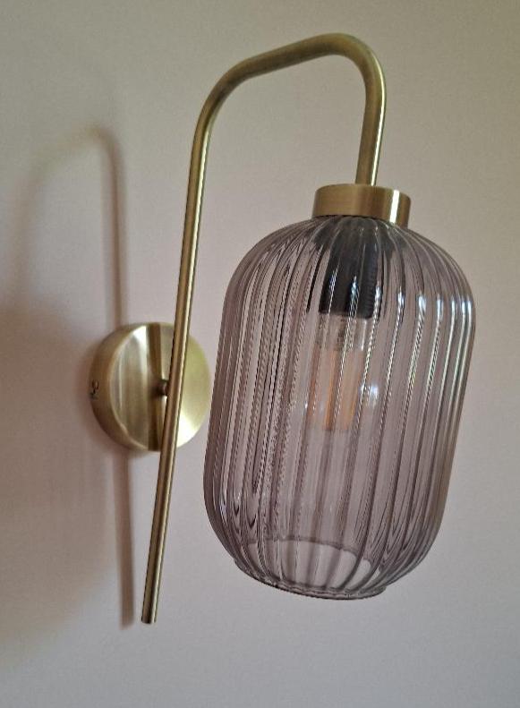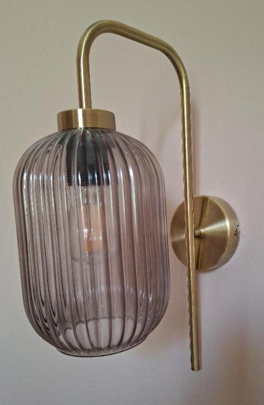 Paire d’appliques, globes en verre fumé strié, socle en laiton. 41 x 14 cm. 6 unités. Vendu à l’unité avec faculté de réunion. Localisation: BLB, 3 rue de la Fossé aux Leux – 91700 Sainte Geneviève des Bois