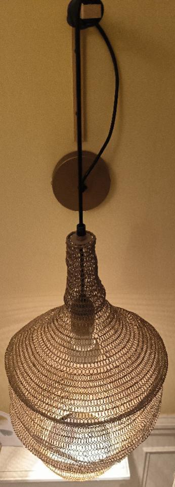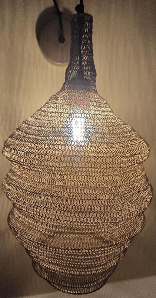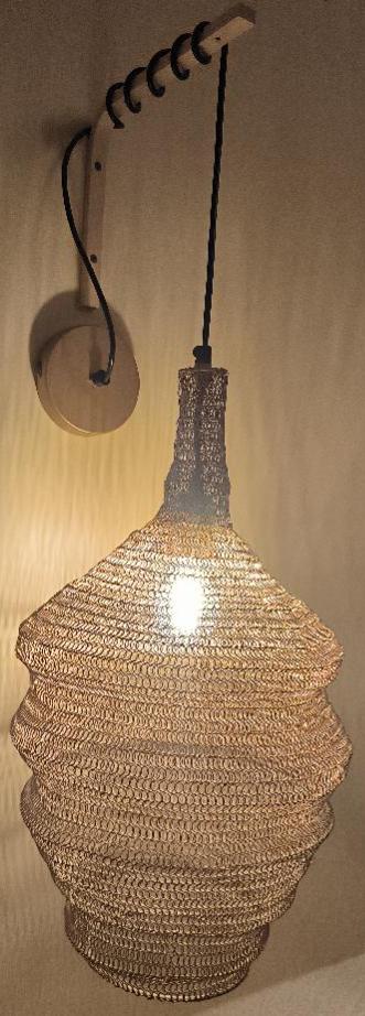 Paire d’appliques murales en cotte de maille de couleur marron, en forme de nasse. Dim : 80 x 40 cm. 3 unités. Vendu à l’unité avec faculté de réunion. Localisation: BLB, 3 rue de la Fossé aux Leux – 91700 Sainte Geneviève des Bois