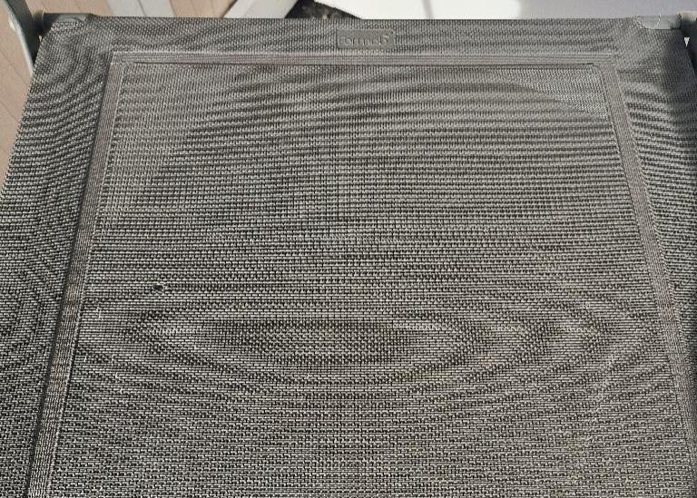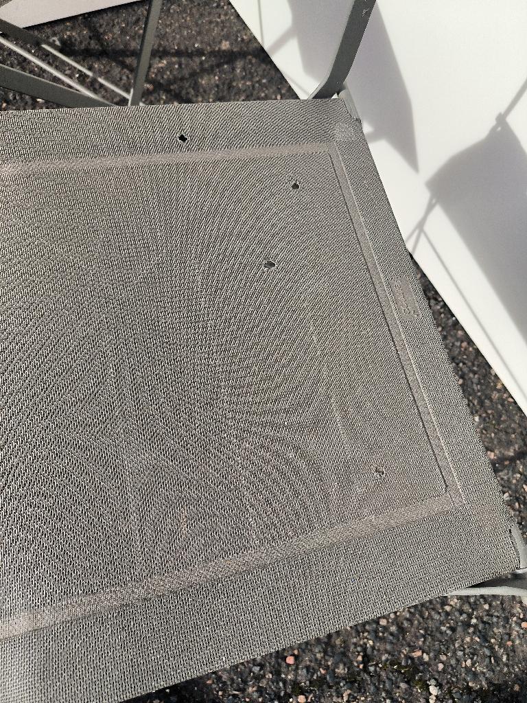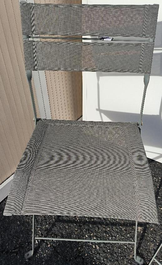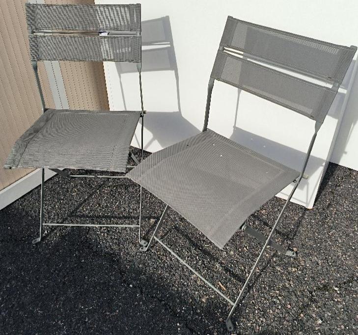 Paire de chaises d’extérieur pliantes en métal anthracite de marque Fermob, dossier et assise en tissu « OTF Batyline® ». Dim. : 88 x 45 x 42 cm. (usures, trous dans les assises). Localisation : 30 rue Beauregard 60440 Nanteuil-le-Haudouin.