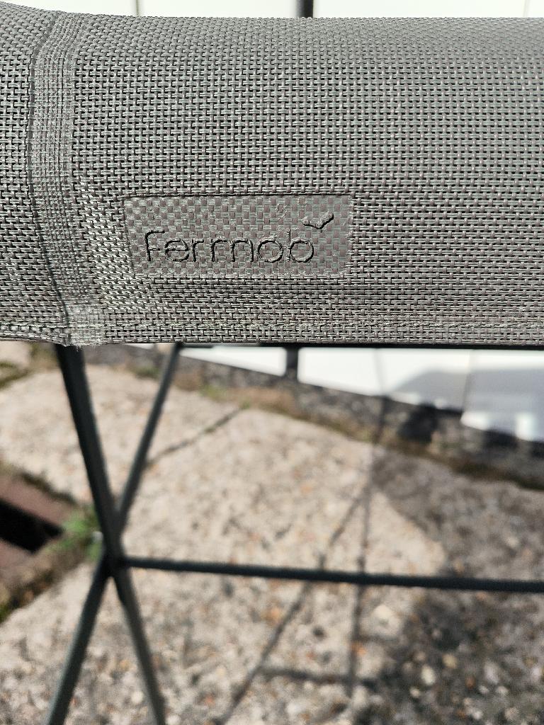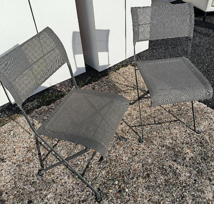 Paire de chaises d’extérieur pliantes en métal anthracite de marque Fermob, dossier et assise en tissu « OTF Batyline® ». Dim. : 90 x 43 x 45 cm. Localisation : 30 rue Beauregard 60440 Nanteuil-le-Haudouin.