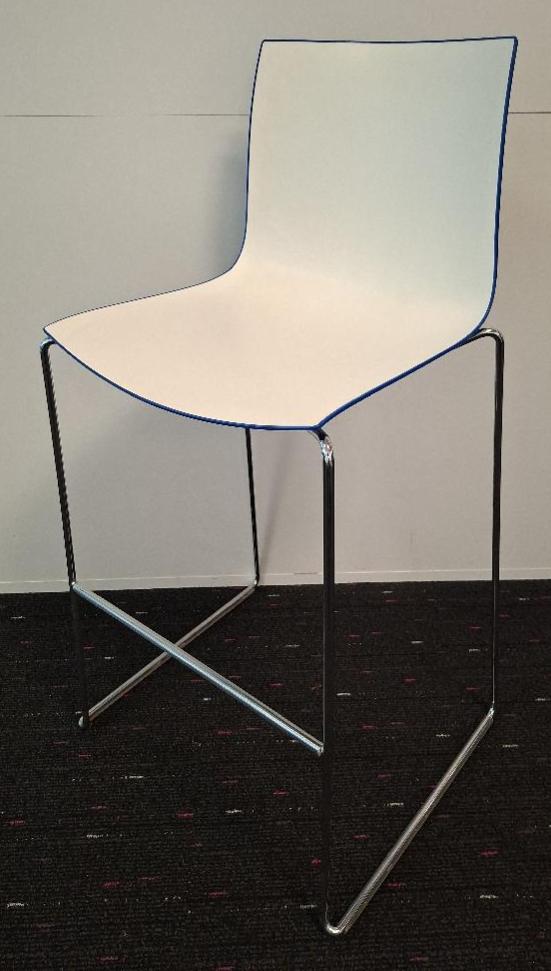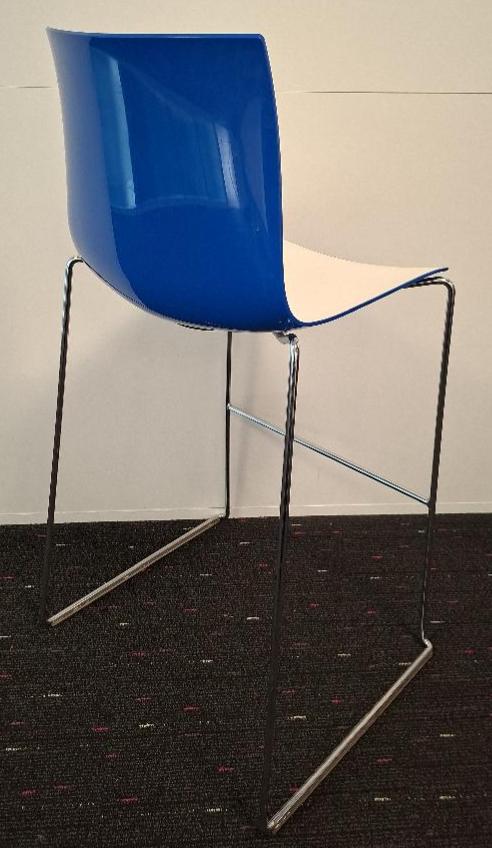 Paire de chaises hautes empilables design Leviore Altherr Molina modèle Califa 46 édition Arper, coque en polypropylène intérieur blanc extérieur bleu, piétement luge en acier chromé avec repose-pieds. 111 x 45 x 53 cm. (1er). Localisation: 10 rue d’Arcueil – 94150 Rungis