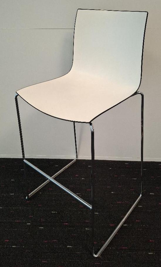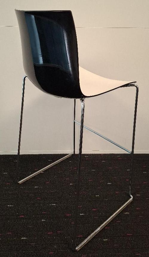 Paire de chaises hautes empilables design Leviore Altherr Molina modèle Califa 46 édition Arper, coque en polypropylène intérieur blanc extérieur noir, piétement luge en acier chromé avec repose-pieds. 111 x 45 x 53 cm. (1er). Localisation: 10 rue d’Arcueil – 94150 Rungis