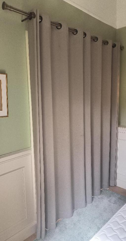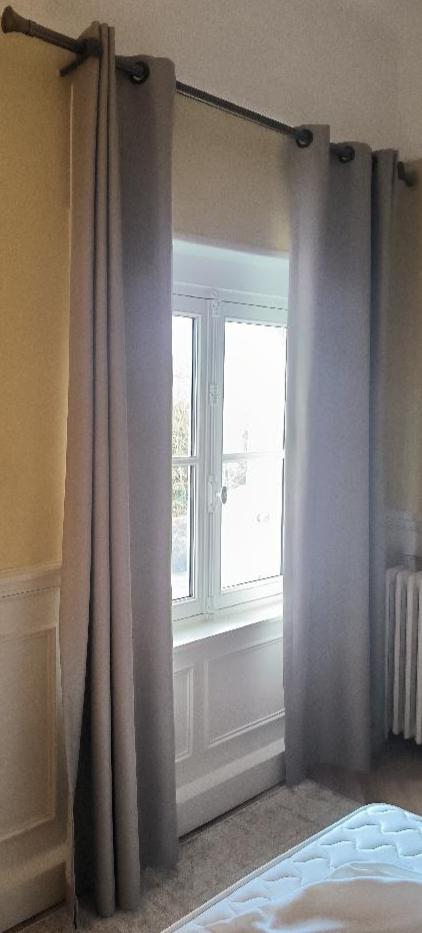 Paire de rideaux occultants de couleur taupe avec sa tringle. Dim : 230 x 200 cm. 9 unités. Vendu à l’unité avec faculté de réunion. Localisation: BLB, 3 rue de la Fossé aux Leux – 91700 Sainte Geneviève des Bois