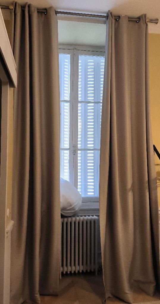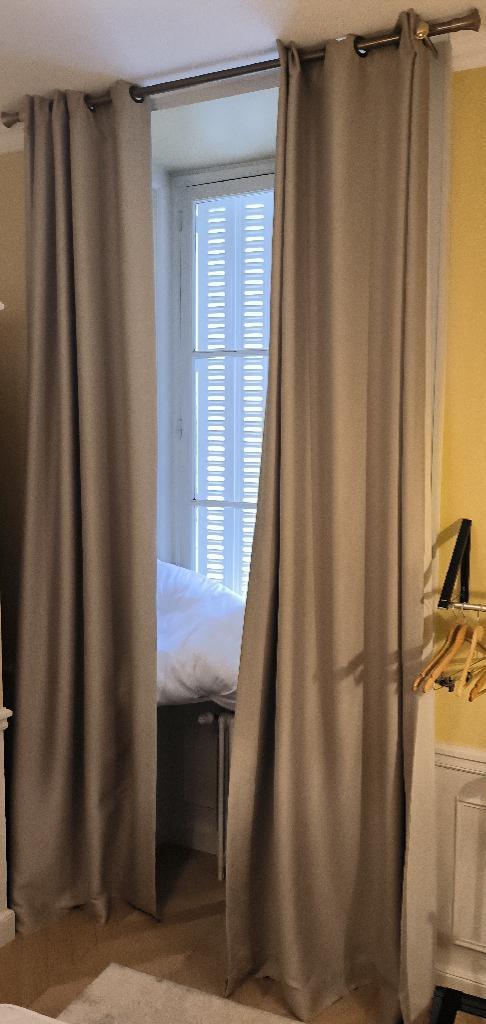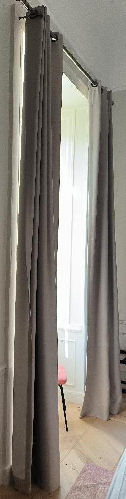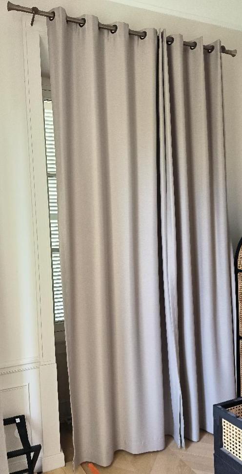 Paire de rideaux occultants de couleur taupe avec sa tringle. Dim : 340 x 200 cm. 28 unités. Vendu à l’unité avec faculté de réunion. Localisation: BLB, 3 rue de la Fossé aux Leux – 91700 Sainte Geneviève des Bois