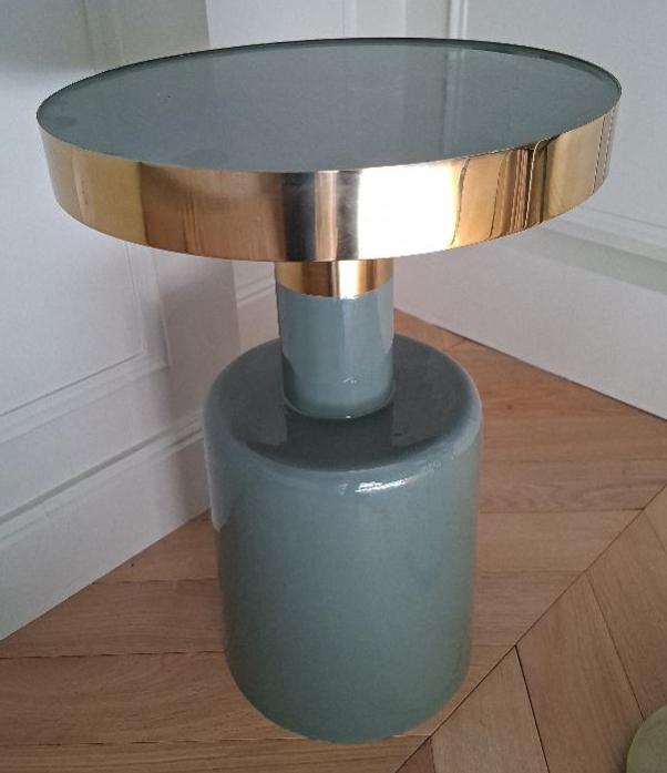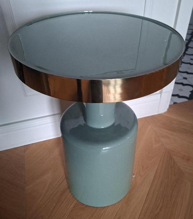 Paire de tables de chevet ou bouts de canapé en métal vert céladon et doré. 52 x 36 cm. 3 unités. Vendu à l’unité avec faculté de réunion. Localisation: BLB, 3 rue de la Fossé aux Leux – 91700 Sainte Geneviève des Bois