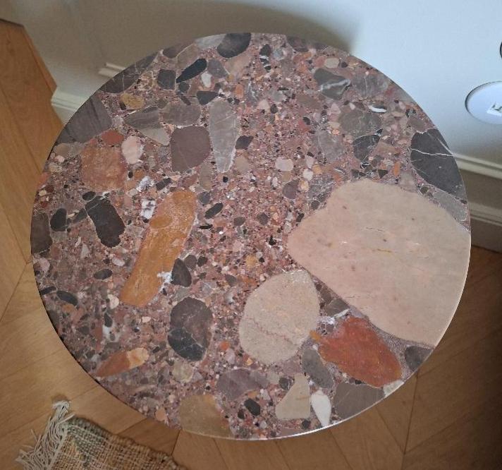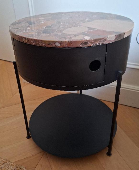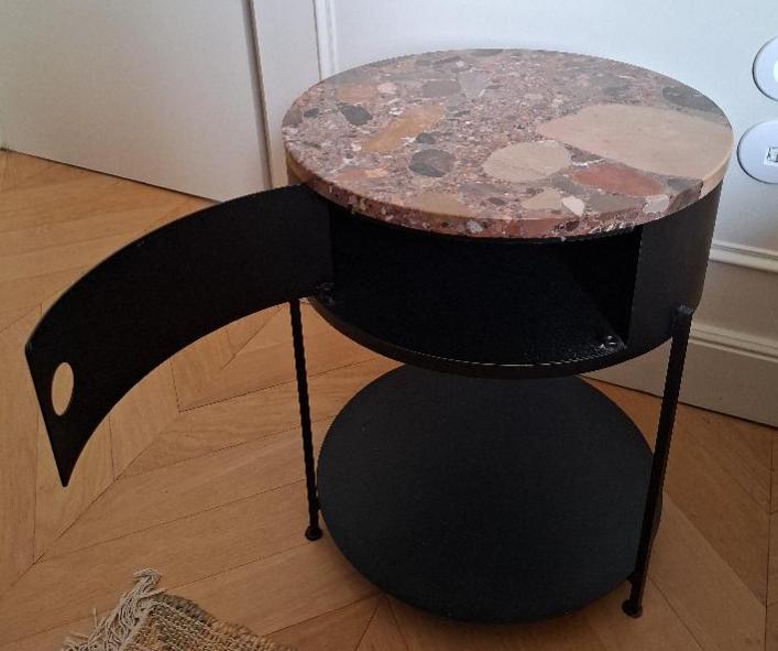 Paire de tables de chevet, structure en acier mat noir, plateau rond en marbre brèche, une étagère en partie basse et un tiroir. 50 x 40 cm. 10 unités. Vendu à l’unité avec faculté de réunion. Localisation: BLB, 3 rue de la Fossé aux Leux – 91700 Sainte Geneviève des Bois