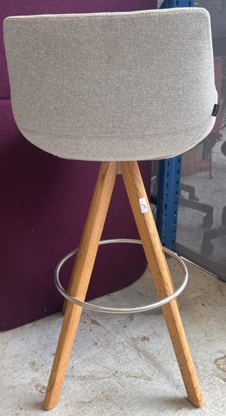 Paire de tabourets hauts pivotants design Christophe Pillet modèle Dunas édition Inclass en tissu beige écru, 4 pieds obliques en bois naturel avec repose pied en acier chromé. 99 x 46 x 50 cm. Localisation : 10 rue du Ballon – 93160 Noisy-Le-Grand