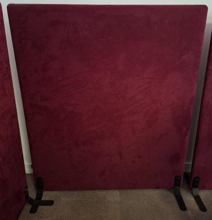 Panneau de séparation acoustique de marque Gotessons recouvert de velours bordeaux, piétement en acier laqué noir. 142 x 120 cm. 5 unités. Vendu à l’unité avec faculté de réunion. Localisation: 26 rue Cambaceres – 75008 Paris. (3eme: 3 unités, 4eme: 2 unités)