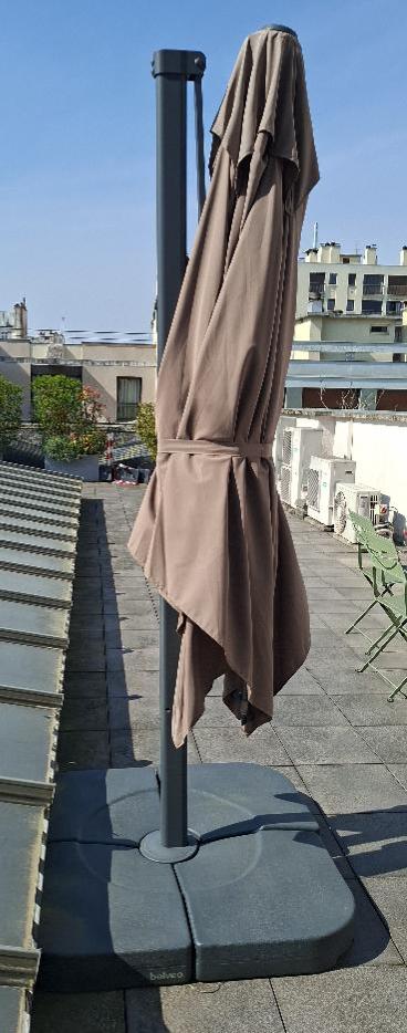 Parasol déporté de marque Belvéo modèle Sofy, toile de couleur beige foncé. Dimension déplié 3 x 3 m. Localisation: 30 rue Beauregard - 60440 Nanteuil-Le-Haudouin. – Image 3