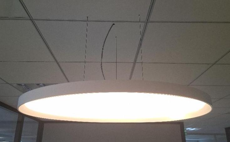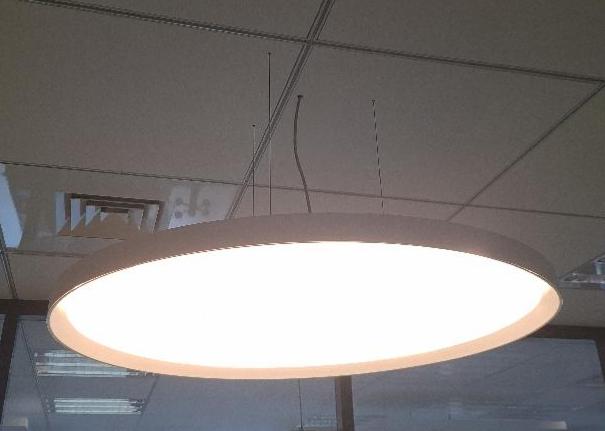 Plafonnier suspendu par 3 filins de marque S.Luce modèle Bela, abat-jour rond en plastique blanc, diffuseur à led. Diamètre 80 cm. 2 unités. Localisation: 5ème étage zone verte (1 unités) / 2ème étage zone rouge (1 unité)