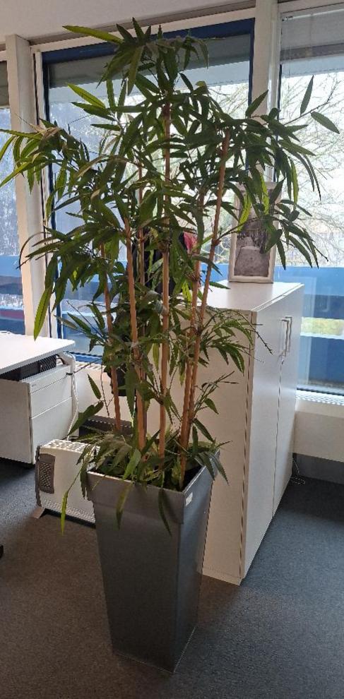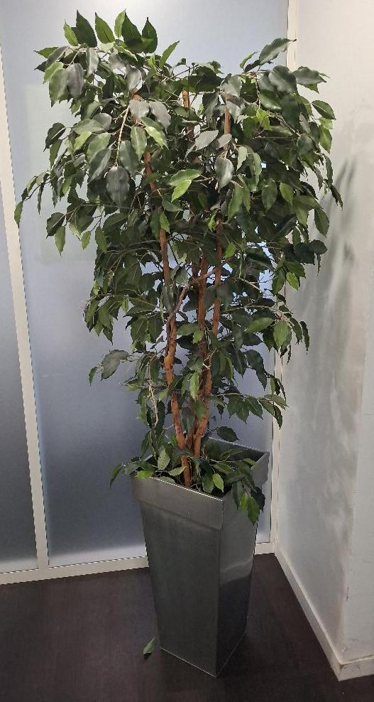 Plante artificielle dans une jardinière en tôle grise. Dim pot: 70 ou 60 x 34 x 34 cm. Hauteur avec plante : env 190 cm, divers modèles. 6 unités. Localisation: 1er étage local CSE (4 unités) / 0 ludothèque (2 unités)