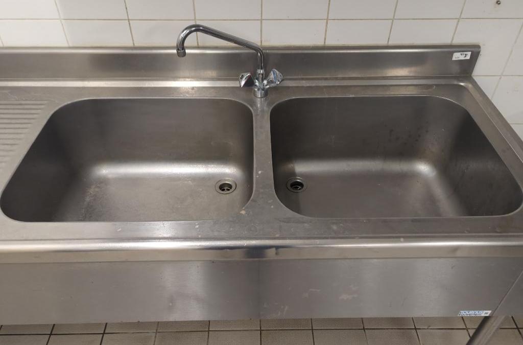 Plonge adossée 2 bacs en inox alimentaire. 101 x 190 x 70 cm. Localisation: Tour Coeur Défense – 92400 Courbevoie