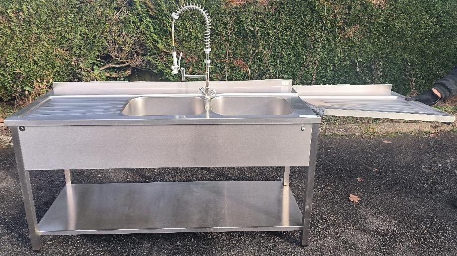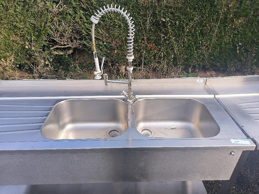 Plonge adossée 2 bacs en inox alimentaire. Dim : 95 x 256 x 70 cm. Localisation : 30 rue Beauregard – 60440 Nanteuil-le-Haudouin