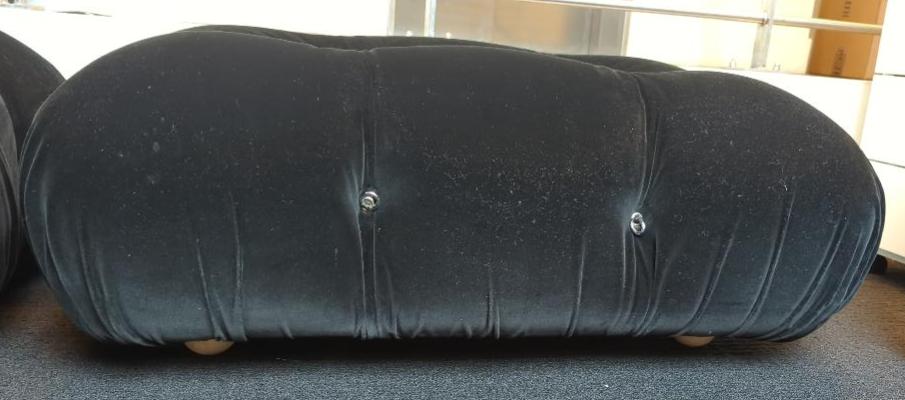 Pouf design Mario Bellini modèle Camaleonda édition B&B Italia recouvert de velours surpiqué noir avec petits crochets en métal, sur 4 patins en bois naturel. 35 x 95 x 60 cm. 2 unités. Vendu à l’unité avec faculté de réunion. Adresse de retrait: 30 rue des Peupliers – 92000 Nanterre