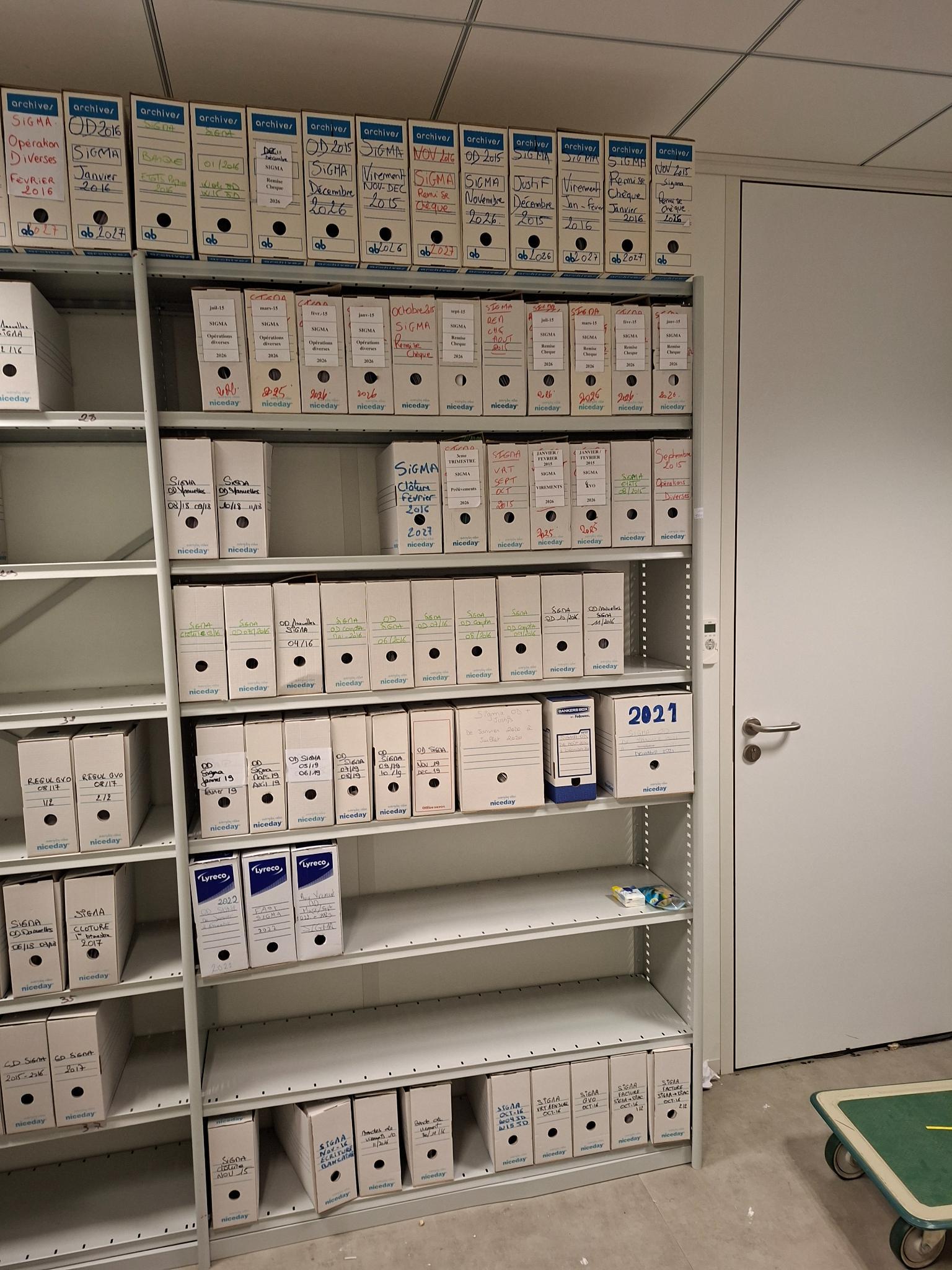 Rayonnage à archives métallique de couleur gris clair comprenant 26 échelles. Dim : 217 x 123 x 34 cm. 31.98M LINEAIRE AU TOTAL.