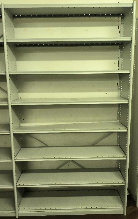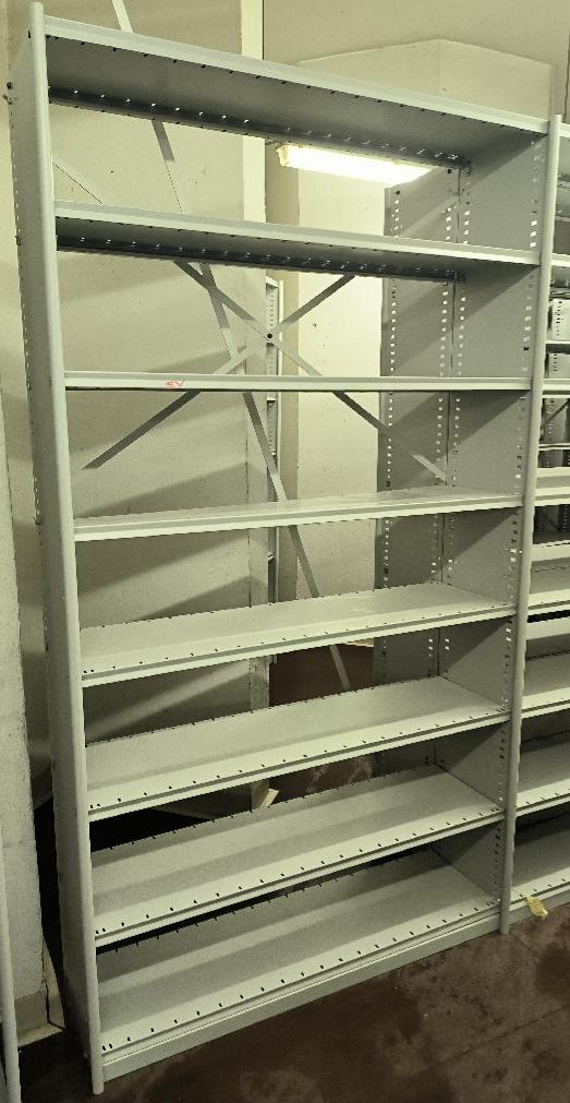 Rayonnage à archives métallique de couleur gris clair comprenant 52 échelles (hauteur 218 cm) et 288 plateaux (largeur 120 cm). 43,20M LINEAIRE AU TOTAL.