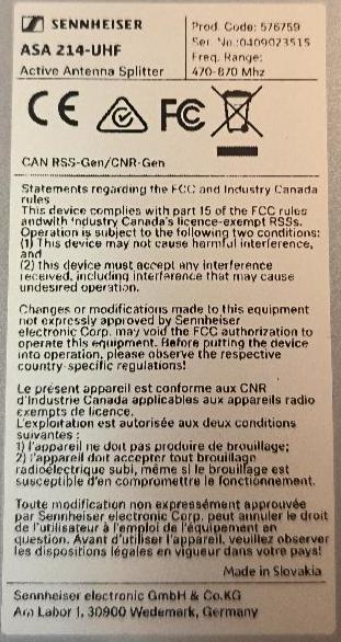 Répartiteur d’antenne UHF de marque Sennheiser modèle ASA 214-UHF. Non testé. Localisation : 30 rue Beauregard 60440 Nanteuil-le-Haudouin