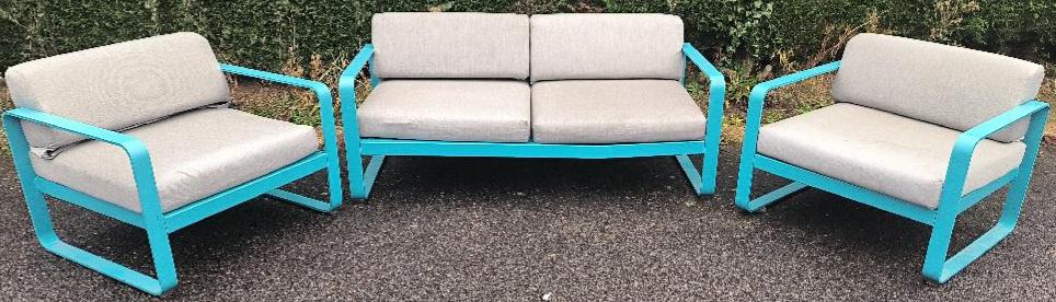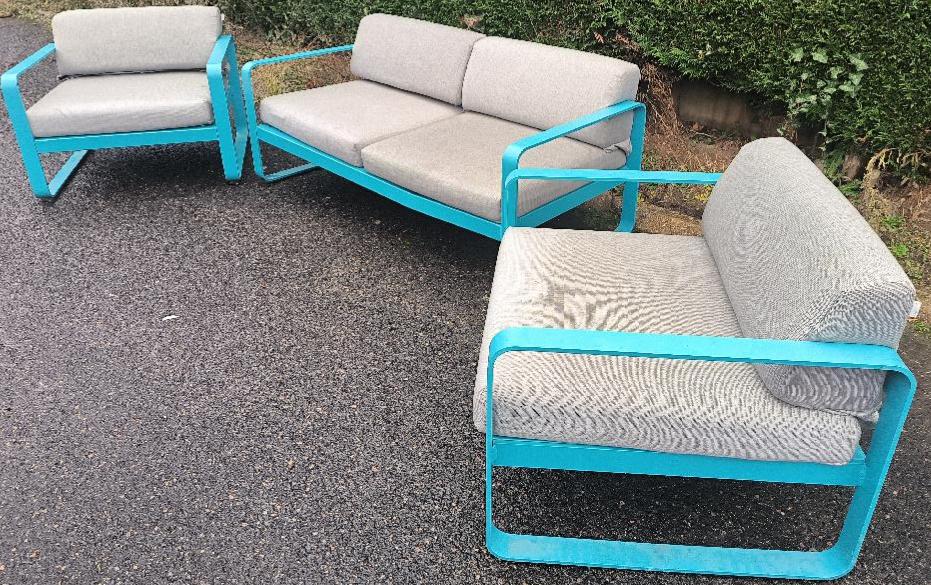 Salon de jardin design Pagnon et Pelhaître modèle Bellevie édition Fermob de couleur bleu comprenant 1 canapé 2 places et 2 fauteuils, structure en aluminium bleu, assise et dossier recouvert de tissu outdoor acrylique gris. canapé : 71 x 160 x 75 cm – Fauteuils : 71 x 85 x 75 cm. Localisation : 30 rue Beauregard 60440 Nanteuil-le-Haudouin