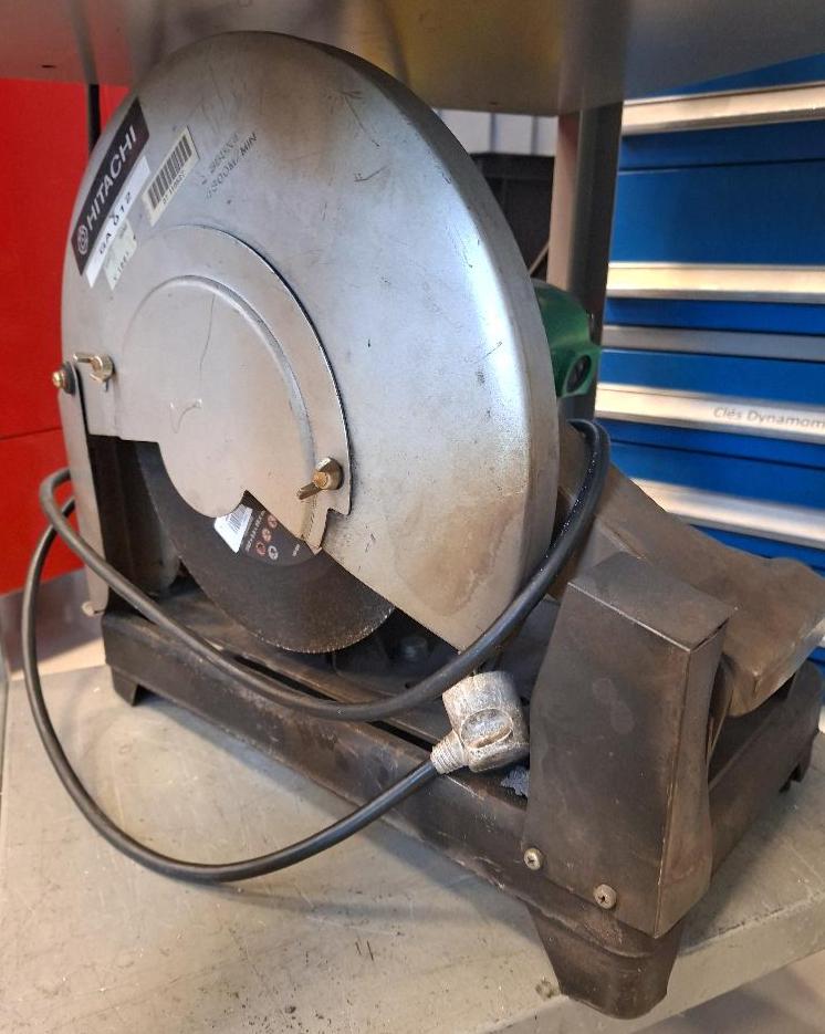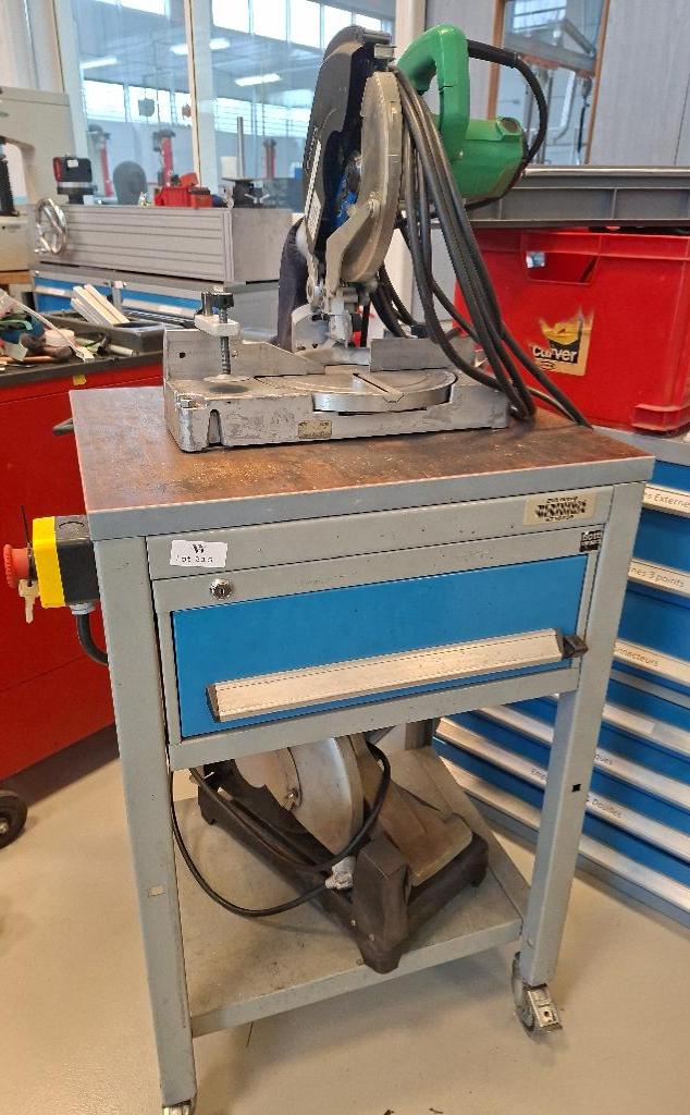 Scie circulaire pour plastiques et aluminium de marque Hitachi modèle S Force 78, vendue avec son support à roulettes à 1 tiroir en ceinture.