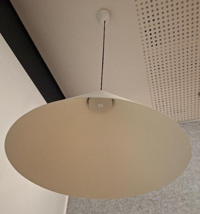 Suspension lumineuse, abat-jour en forme de cône en métal vert céladon. 118 x 56 cm. 6 unités. Vendu à l’unité avec faculté de réunion. Localisation: Tour Coeur Défense – 92400 Courbevoie (TA cafet)