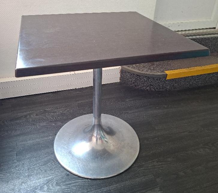 Table 2 personnes de marque Werzalit, plateau en bois stratifié couleur wengé, pied colonne de forme tulipe en acier chromé. 73 x 70 cm. 4 unités. Vendu à l’unité avec faculté de réunion. Localisation: 30 rue Beauregard – 60440 Nanteuil-Le-Haudouin